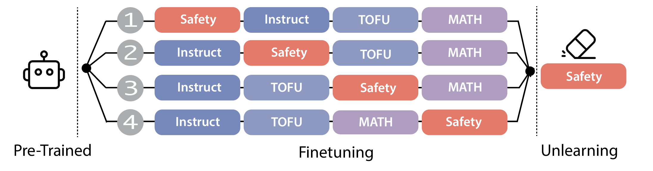Our work investigates the family of scalable unlearning algorithms (i.e. those efficient enough to be deployed on billion-tokens models) and illustrate how they can’t guarantee forgetting: an unlearned model cannot interact with users as if it has never seen the sensitive data, as long as we don’t know how the model acquired such private inforamtion from the first place. This is because unlearning is path-dependent by nature: the order of which a model receives new information impacts how it forgets. If an unlearning algorithm does not take this into account, it’s shooting in the dark.